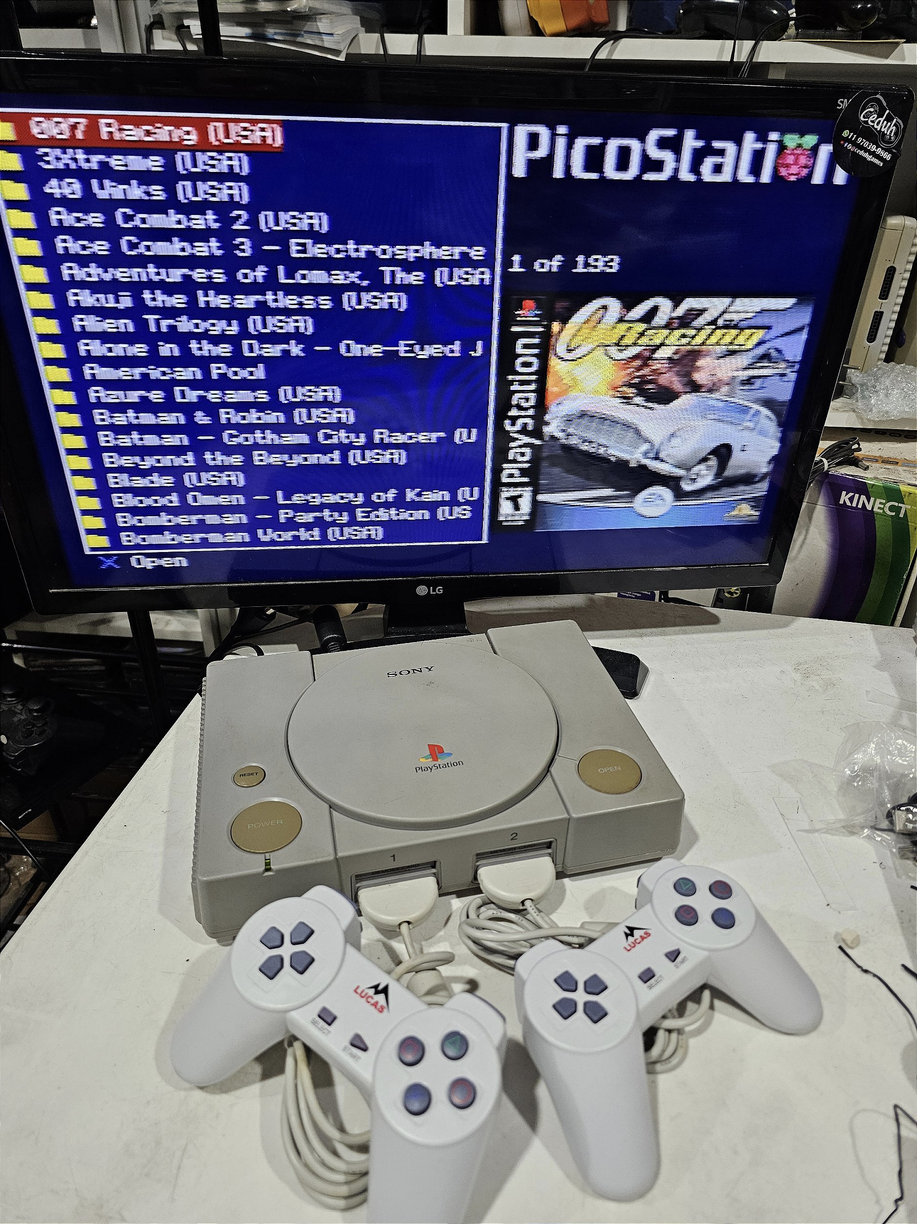 PS1 funcionando perfeitamente, acompanha acessórios Paralelos como um controle, cabo AV, fonte e jogo aleatório brinde.